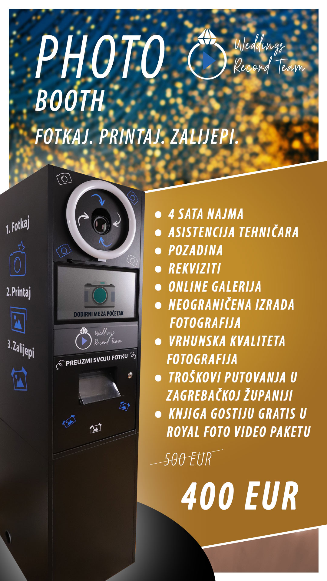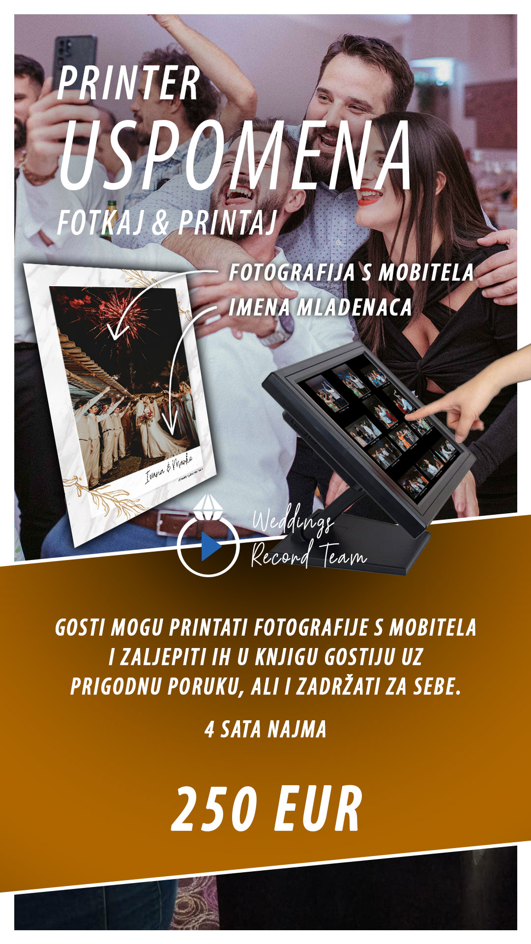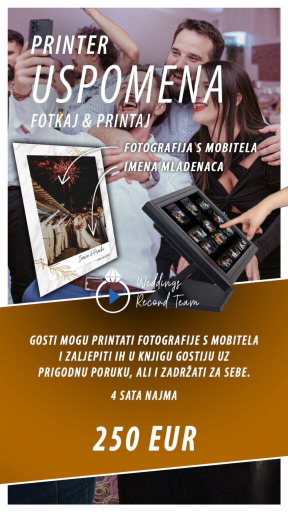 ODLIČAN 140 recenzijeObjavljeno na Andrea Kovačić Brtan Zahvale i tople preporuke za Wedding Record Team iz Velike Gorice. Odlična usluga, prekrasne fotografije i Fotobook.Objavljeno na Dominik Barbaric Odličan Team, dečki su jako simpatični i profesionalni tako da smo se i mi s njima brzo opustili. Jako smo zadovoljni sa slikama a pogotovo sa snimkom vjenčanja. Snimili i uslikali su sve važne momente, čak i detalje koje na dan vjenčanja nismo ni primjetili. Materijal smo dobili u dogovorenom roku. Photobook je isporučen u velikoj drvenoj kutiji, a uz usb stick smo dobili i par izrađene slike u jednoj maloj kutiji. Sve preporuke od nas i jos jednom HVALA na lijepim uspomena. Ana&DominikObjavljeno na Eni Pajković Naše vjenčanje 9.9.2023. Slike su bile super, još bolje kad smo ih dobili u booku. Ali još više nas je oduševio video, kratki i dugi...❤️Objavljeno na Gloria Glibo Izvrsna usluga i kvaliteta fotografija! Za svaku preporuku ????Objavljeno na Andrea Lopar Weddings Record Team je simpatičan, profesionalan i mlad tim koji su stručnjaci u svom poslu. Bili su jako pristupni, komunikacija je bila bez problema i dali su nam super savjete u pripremi. Sve su naše želje saslušali i pomogli su nam oko rasporeda dana. Imali smo vjenčanje gdje je mladoženja bio Nizozemac, no oni su sve super izvršili na Engleskom. Sve je bilo jasno na danu vjenčanja i na samom danu su se trudili da sve bude po našim željama. Photobooth na dan vjenčanja je bio hit i cijelo večer je bila gužva kod Photobootha! (Predivna) knjiga gostiju je popunjena sa slika gostiju, a zahvalnice iz Photobootha su bile svima super za lijepu uspomenu ❤️ Pa sad najvažnije: kako su nam ispale slike i video? Ostali smo bez riječi kad smo vidjeli slike, jer nismo mogli vjerovati kako su dobro uhvatili sve važne trenutke. slike su čiste, uređene i u modernom stilu. Photobook je predivno ispao, a za isporuku materijala su ubacili super detalje, kao kutica sa našim imenima i slika u okviru. Dobili smo tri videa, a sve tri su bile super montirane i dirljive. Neznam koliko puta smo već gledali te snimke, ali su nam tako lijepo sve složili da ne žalimo ništa. Snimke sa dronom su bili cool dodatak! Mislim da pola toga nisam opisala što je ovaj tim za nas uradio, ali ako želite predivne slike i snimke, nećete se sažalit ako se odlučite za ovu ekipu. Hvala vam puno na svemu, bez vas naš dan ne bi prošao ovako dobro a i uspomene ne bi bile tako slatke ????Učitaj više