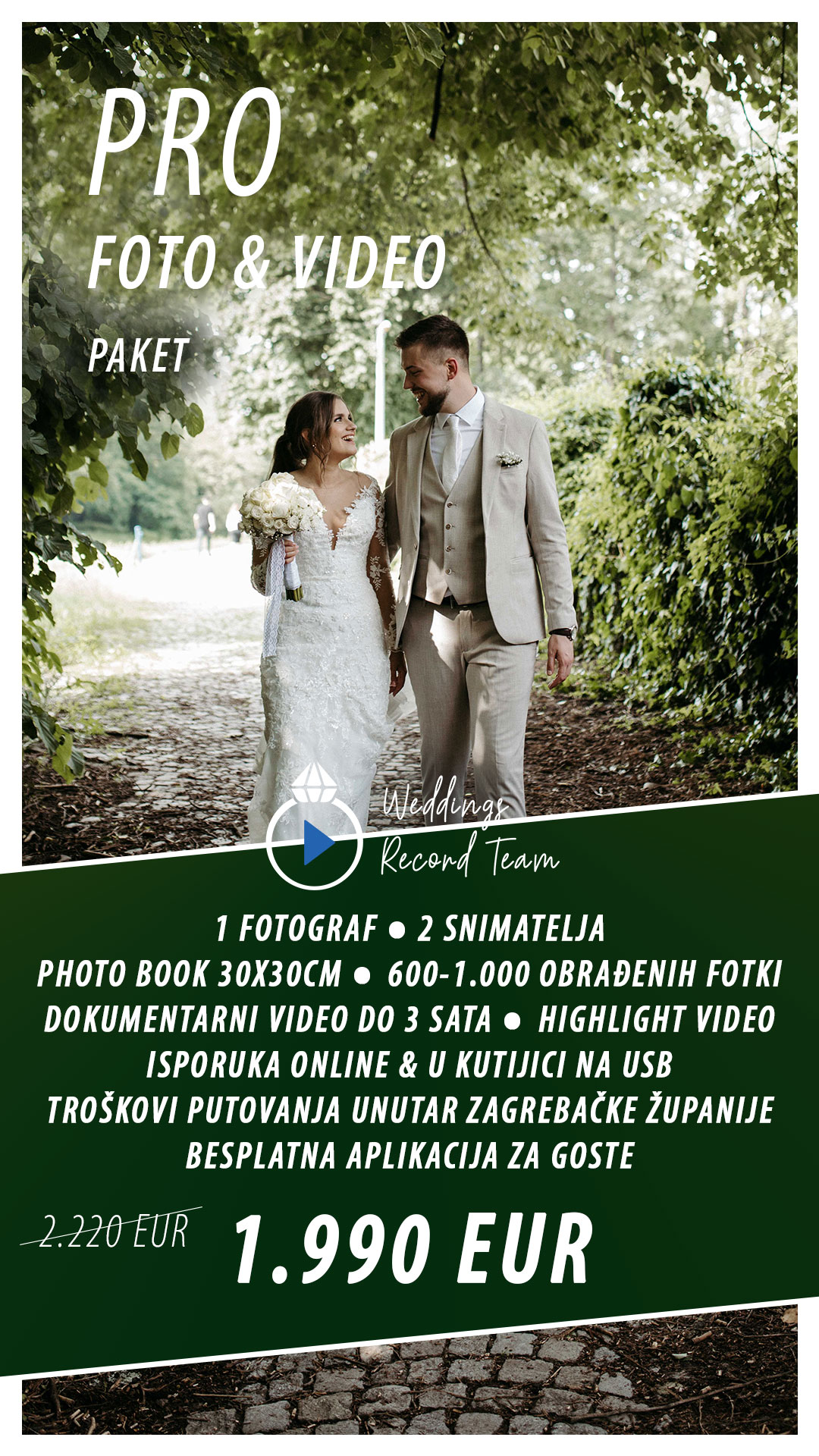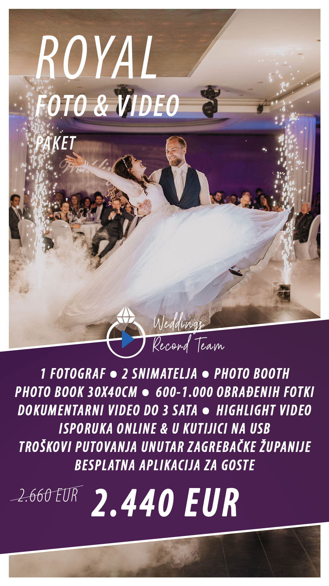 Rezervacija termina se vrši potpisom ugovora i uplatom akontacije 150eur. Plaćanje je 50% do dana vjenčanja, te drugih 50% prilikom isporuke materijala.
